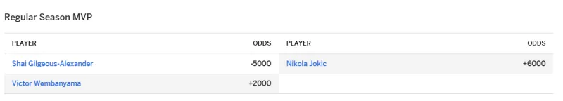 虎扑04月09日讯 今日ESPN官方更新了常规赛MVP的赔率榜单,雷霆球员谢伊-吉尔杰斯-亚历山大继续以-5000的赔率位居榜首,马刺球员维克托-文班亚马+2000位居次席,掘金球员约基奇以+6000的赔率排在第三位。