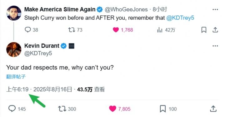 球迷借库里调侃杜兰特遭回怼:连你父亲都敬我三分 你凭什么不服? 日期:2025-09-14 19:27:29 作者:xiaoqiao 栏目:意甲 浏览:247 评论:0 8月16日快讯 网友WhoGeeJones于今晨6:17在推特点名杜兰特发文称:"库里在你加盟前后都拿过总冠军,别忘了这事@KDTrey5"杜兰特仅用2分钟便犀利回击:"你父亲都敬重我,你凭什么不?" 延伸阅读: 法兰克福将帅:我们创造很多机会但效率不佳,运气更好的队晋级了 继续追梦!26岁姆巴佩仍未能染指欧冠冠军,9个赛季最好成绩亚军 切尔西绝平仍原地踏步,波切蒂诺生日被球迷喊滚蛋 吉列尔梅谈回归中超:很顺利适应 满意开局势头 罗马诺透露布纳诺特倾向加盟多特,布莱顿或压哨放人 球迷借库里调侃杜兰特遭回怼:连你父亲都敬我三分 你凭什么不服? 标签: 上一篇:巴萨半场0-0马洛卡数据:射门24-0,射正6-0,控球率78%-22% 下一篇:KAIYUNAPP:开启智慧生活的新方式